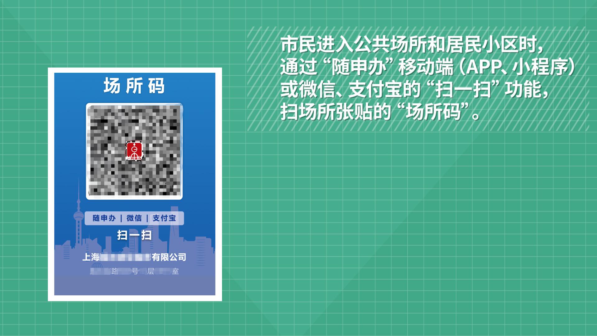市民进入公共场所和居民小区时,通过“随申办”移动端(APP、小程序)或微信、支付宝的“扫一扫”功能,扫场所张贴的“场所码”。