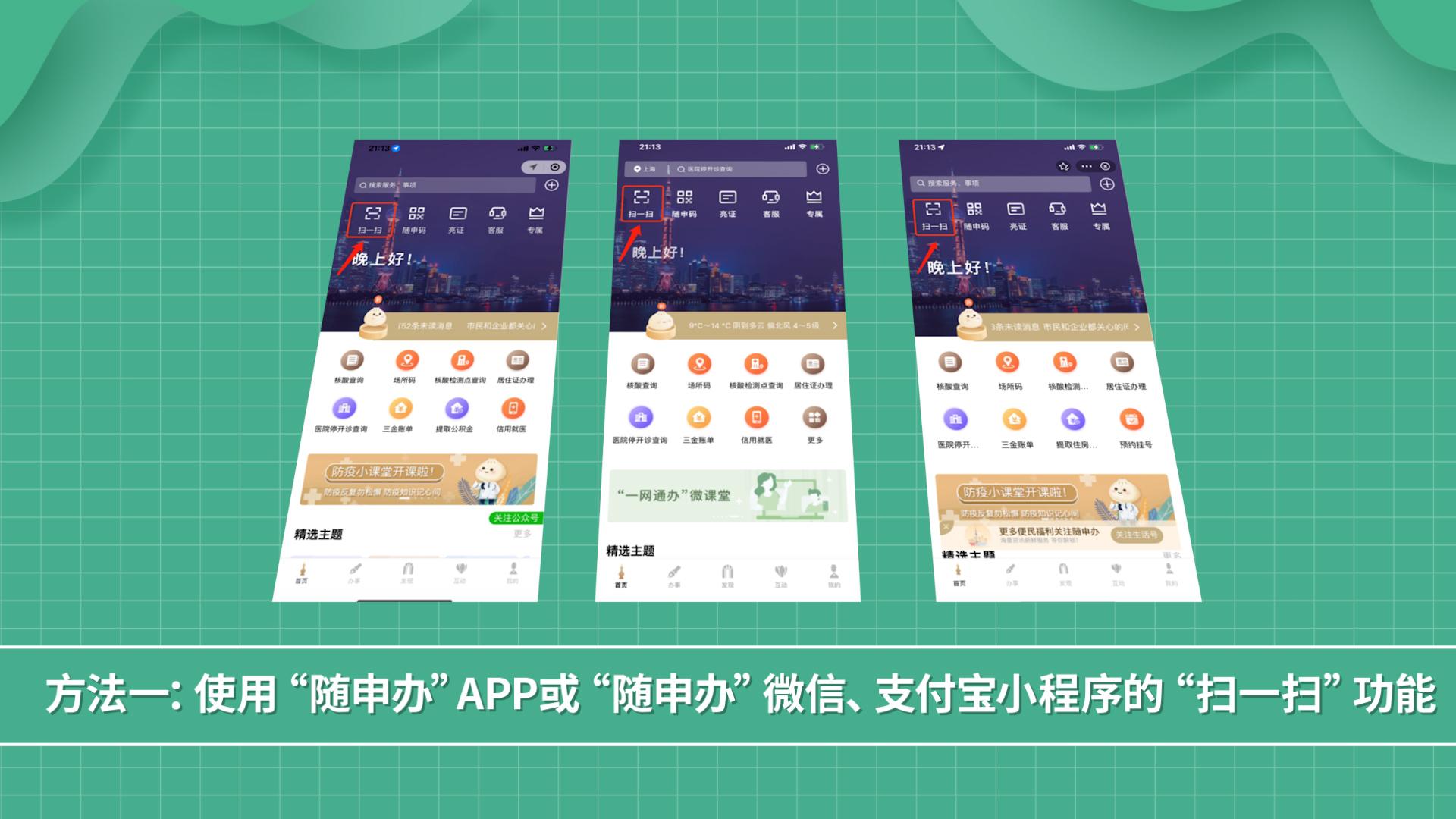 方法一:使用“随申办”APP或“随申办”微信、支付宝小程序的“扫一扫”功能