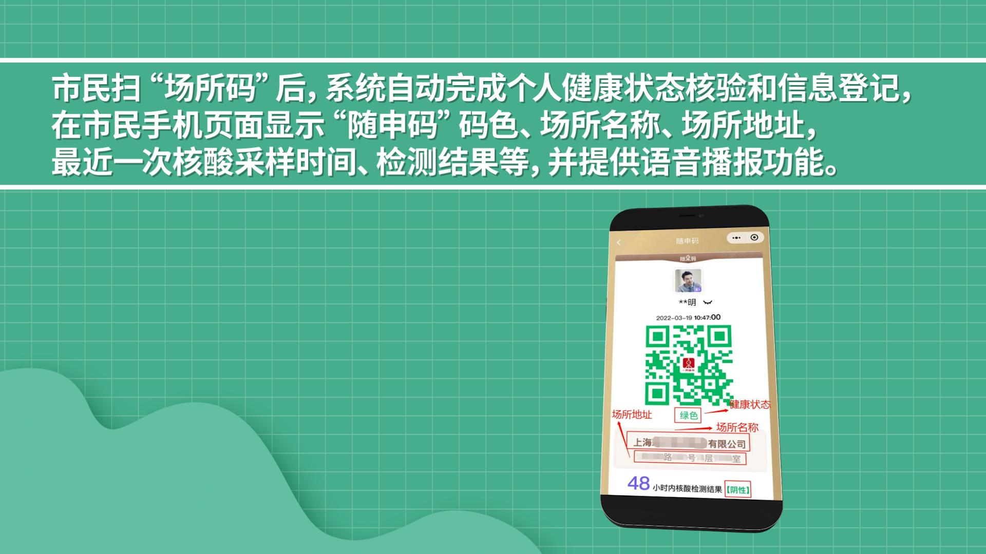 市民扫“场所码”后,系统自动完成个人健康状态核验和信息登记,在市民手机页面显示“随申码”码色、场所名称、场所地址,最近一次核酸采样时间、检测结果等,并提供语音播报功能。