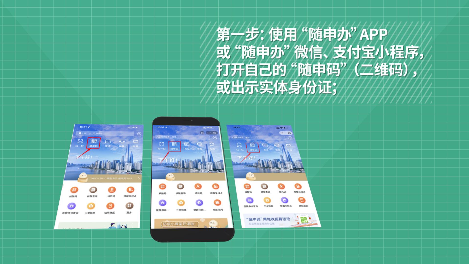 第一步:使用“随申办”APP或“随申办”微信、支付宝小程序,打开自己的“随申码”(二维码),或出示实体身份证;