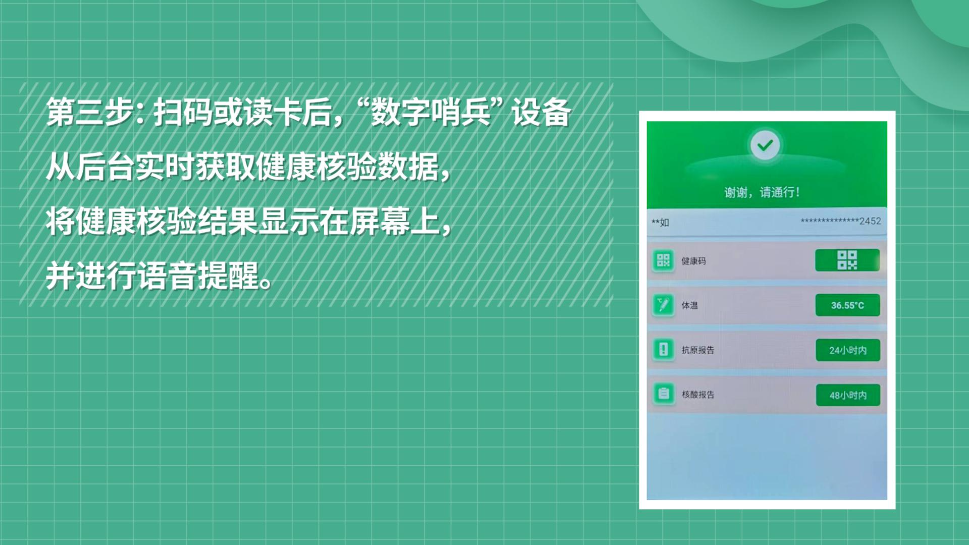 第三步:扫码或读卡后,“数字哨兵”设备从后台实时获取健康核验数据,将健康核验结果显示在屏幕上,并进行语音提醒。