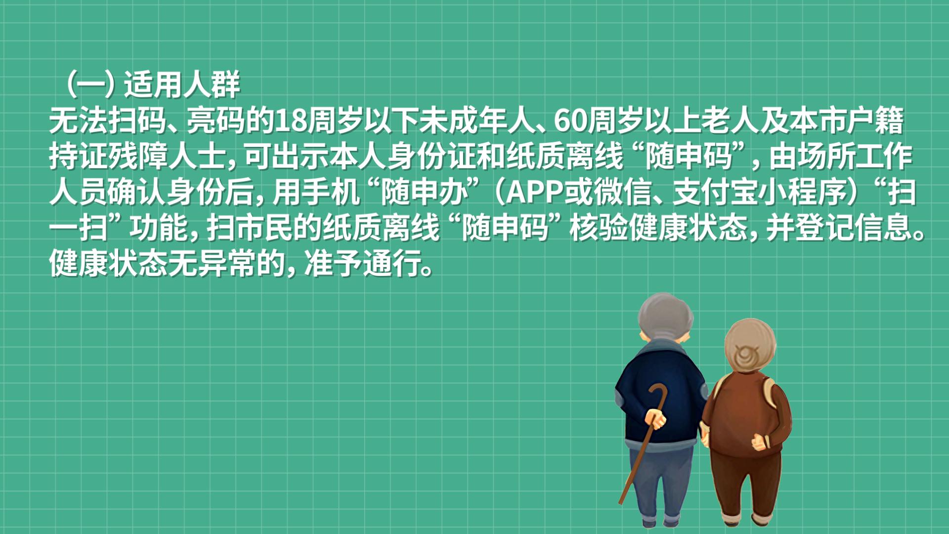 无法扫码、亮码的18周岁以下未成年人、60周岁以上老人及本市户籍持证残障人士,可出示本人身份证和纸质离线“随申码”,由场所工作人员确认身份后,用手机“随申办”(APP或微信、支付宝小程序)“扫一扫”功能,扫市民的纸质离线“随申码”核验健康状态,并登记信息。健康状态无异常的,准予通行。