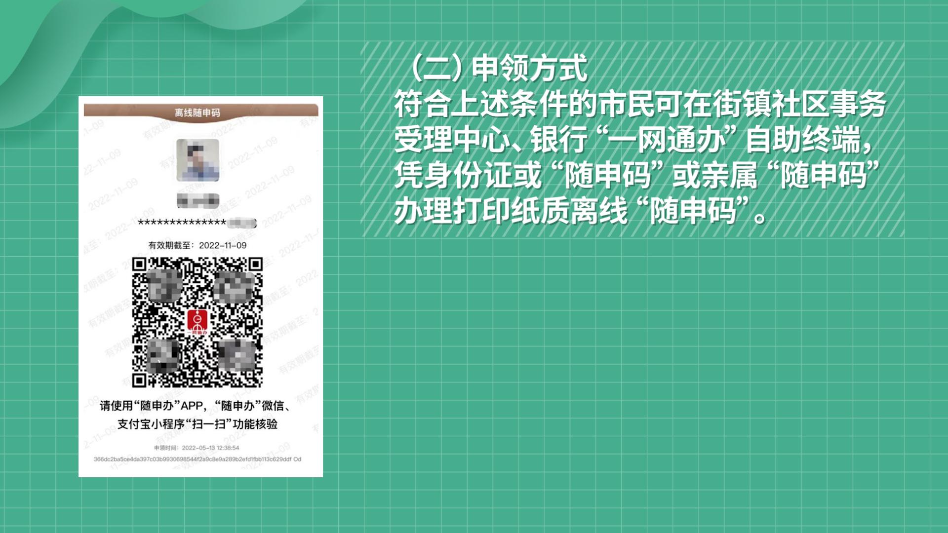 符合上述条件的市民可在街镇社区事务受理中心、银行“一网通办”自助终端,凭身份证或“随申码”或亲属“随申码”办理打印纸质离线“随申码”。