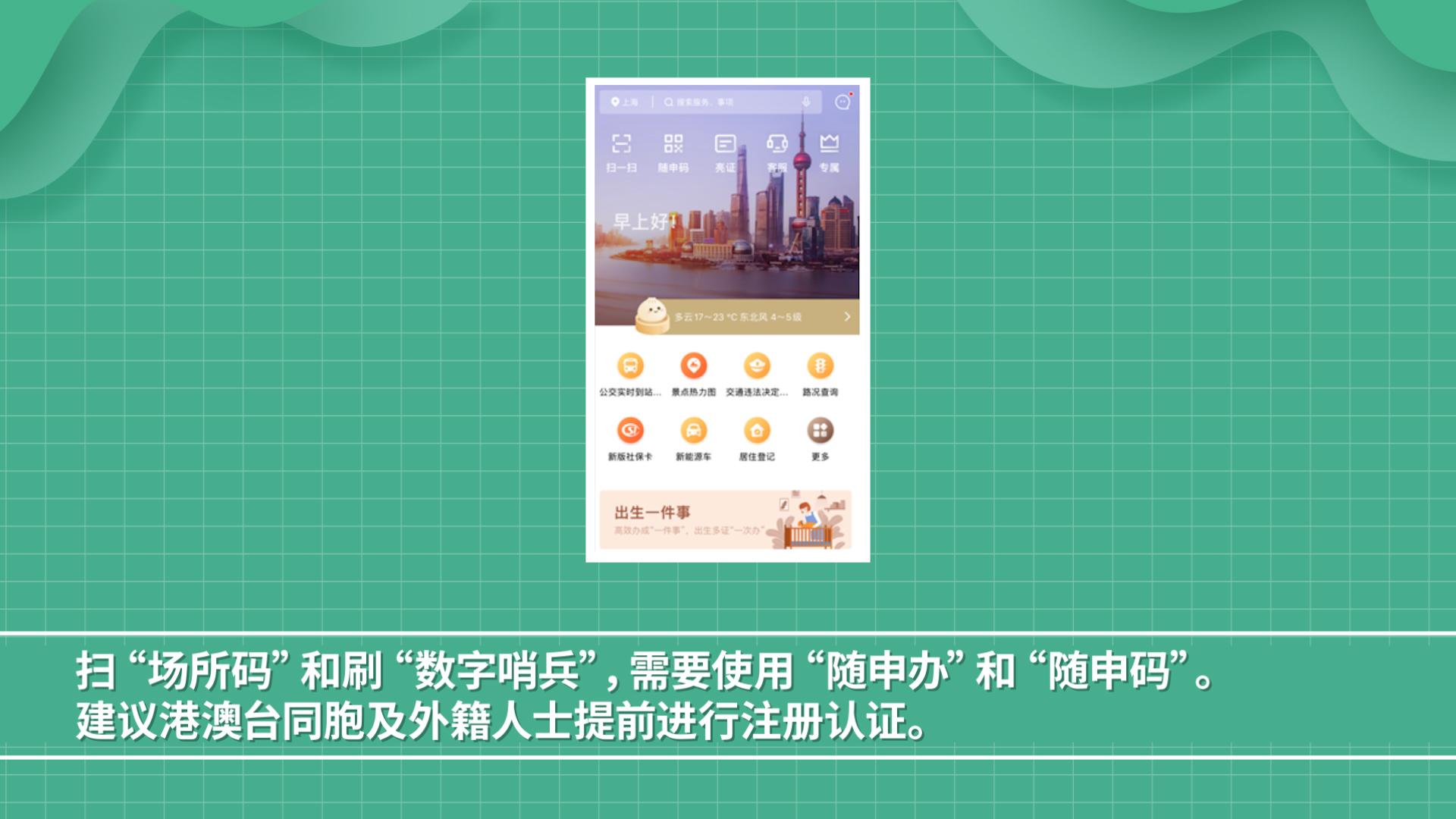 扫“场所码”和刷“数字哨兵”,需要使用“随申办”和“随申码”。建议港澳台同胞及外籍人士提前进行注册认证。