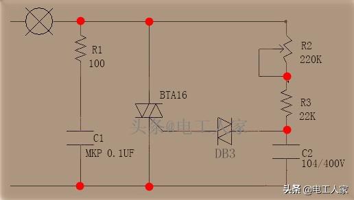 R2、R3、C2、DB3 组成脉冲信号触发双向可控硅BTA16, 使BTA16在市电正负半周均保持相应正反向导通。220伏交流电源经过负载(如灯泡等)、可调电位器R2、电阻R3给电容C2充电,当C2充电电压达到DB3阀值28V时,双向触发二极管导通使电压到达可控硅控制极,使可控硅被触发导通。改变可调电位器R2的阻值,可增大或减小双向可控硅的导通角,使输出电压升高或降低,从而起到调压调光调温调速的目的。