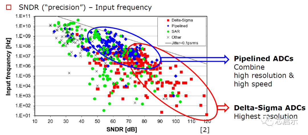 上图是对各种的ADC的一个汇总,可见delta sigma ADC达到了最高的精度。我们知道delta sigma ADC分为连续型,离散型,增量型,适当的设计都可以达到很高的精度,而又属增量型delta sigma得到的精度最高。