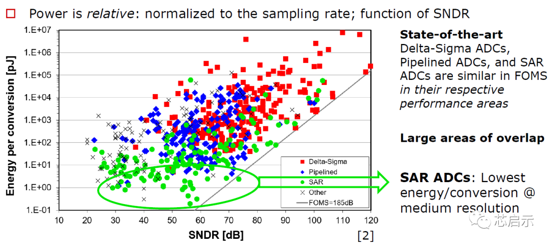 从功耗的角度,三种ADC都有各自的优势,SAR ADC在中低等精度下是能量效率最高的,流水线ADC则在中等精度下能量效率好,delta sigma ADC是在高精度下能量效率遥遥领先。需要指出的是,各种ADC之间的重叠是非常的大的,而且各种ADC混合,获得更好的综合性能也是一种趋势。
