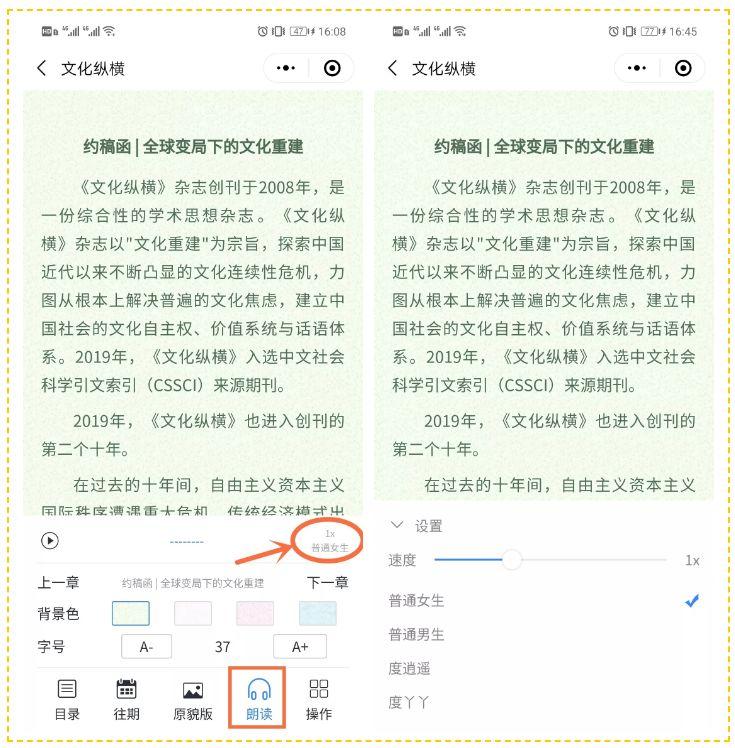 3.文本版带有自动朗读功能,还可选择不同人声、阅读速度体验“听期刊”。