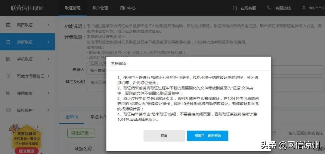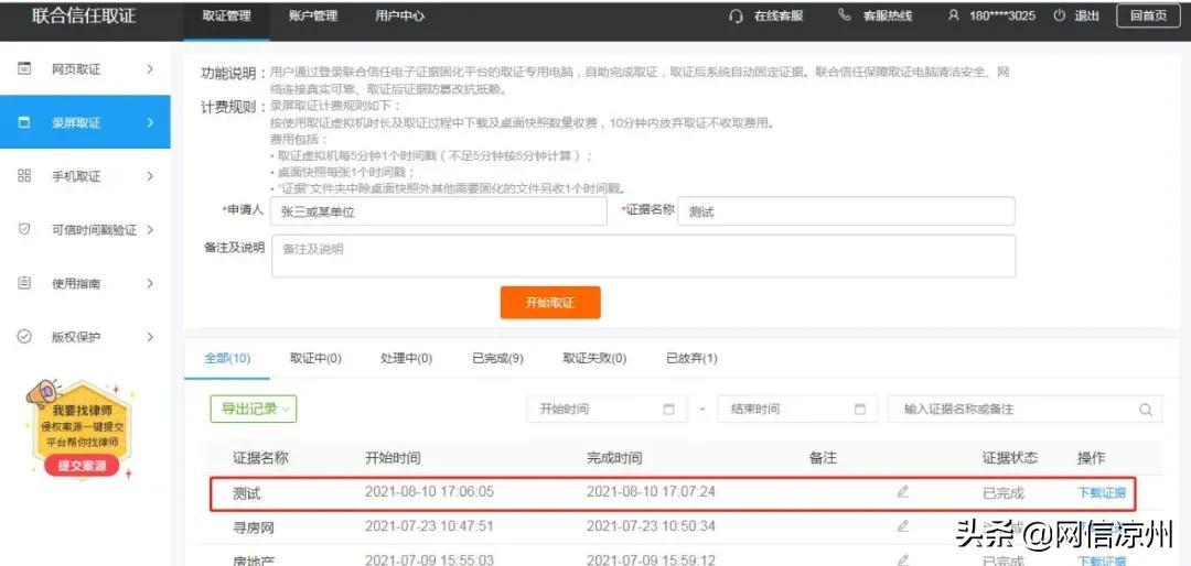 步骤2. 在浏览器页面输入http://ev.tsa.cn/ 进入联合信任电子证据服务平台,注册登录系统,进入录屏取证页面,点击【开始取证】,即可调用该公司系统的远程桌面操作(如图8、图9所示);