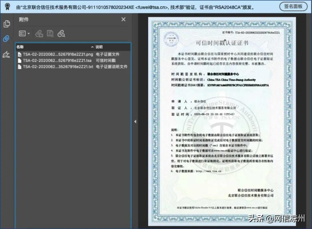 下载后通过Adobe Reader软件打开后,可以看到由联合信任颁发的可信时间戳认证证书(PDF文件),同时在PDF左侧回形针图标
