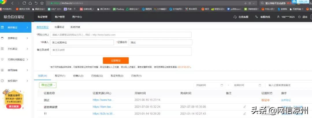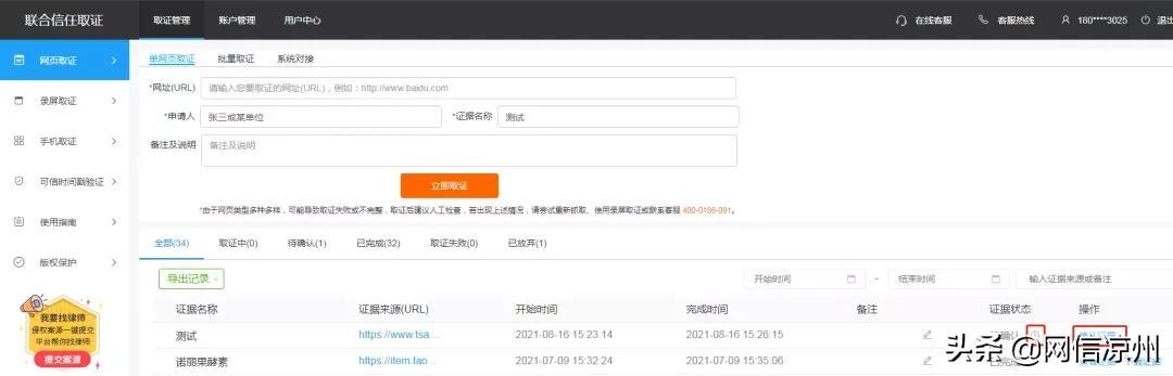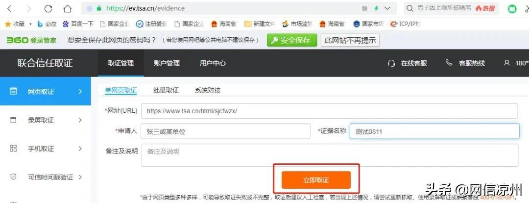 步骤3. 选择【网页取证】,输入需要取证的目标网址(https://www.tsa.cn/html/sjcfwzx/)、申请人、证据名称、备注及说明信息,点击【立即取证】按钮,系统开始自动取证(如图3、图4所示);