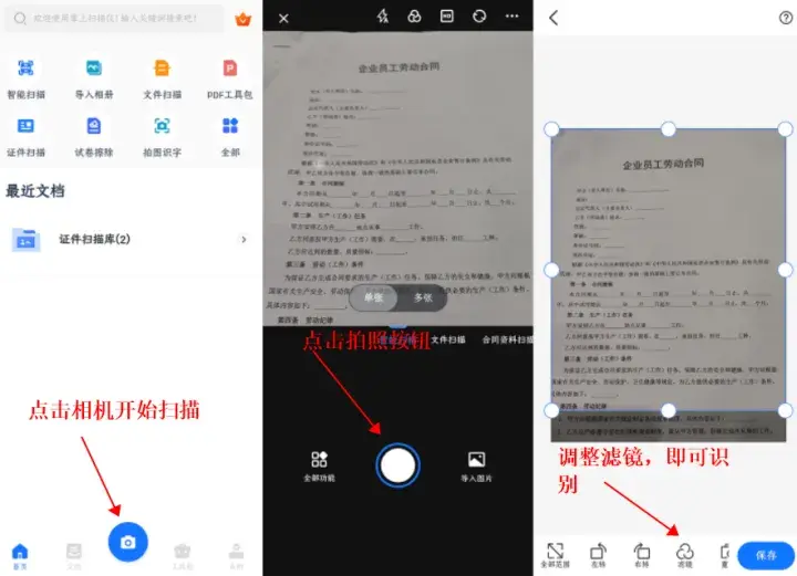 ①打开APP,点击下方的“相机图标”②选择好识别区域,点击拍照③选好合适的滤镜,即可扫描