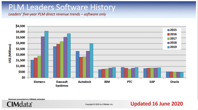 下面的 CIMdata 图表显示了 2015 年至 2019 年期间 PLM 领域大型企业的直接收入(仅软件)的收入发展曲线。