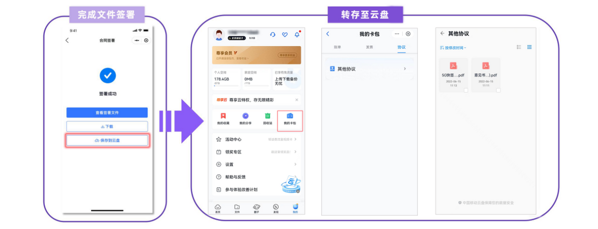 算力时代,万物上“云”,中国移动云盘是中国移动旗下的个人及家庭云存储网盘,用户入网即享云空间、云服务。5G快签协同中国移动云盘,产品能力双向贯通赋能办公场景,打造新型智慧化办公模式。用户在5G快签平台签署的文件可一键转存至云盘,随时随地查阅转发,5G不限速下载,存储无负担,管理更便捷。同时,用户在中国移动云盘使用云笔记功能记录文件,可通过会议快签功能完成文件签署。