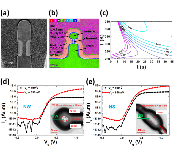 (a)替代栅结构TEM截面,(b)垂直环栅纳米器件TEM截面的EDX元素分布图,(c)氧化-刻蚀模型,(d)n型垂直环栅纳米线器件的Id-Vg特性及TEM俯视插图,(e)n型垂直环栅纳米片器件的Id-Vg特性与TEM俯视插图。