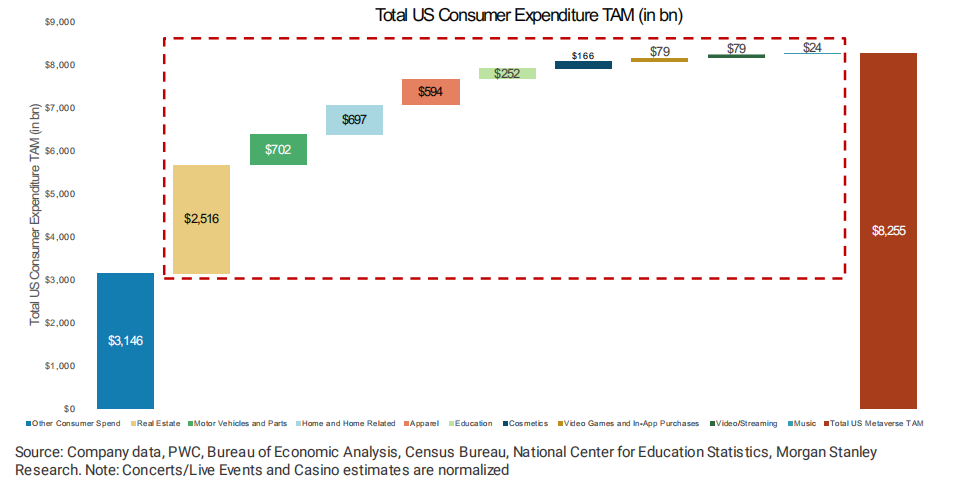 这也意味着美国潜在的消费者支出市场空间(TAM)高达8.3万亿美元,涵盖房地产、核心零售、汽车、游戏等领域。与此同时,摩根士丹利看到了更多沉浸式体验和解锁元宇宙的机会,包括在服装、化妆品、游戏、视频流、汽车、房地产和家居设计、音乐和教育领域。