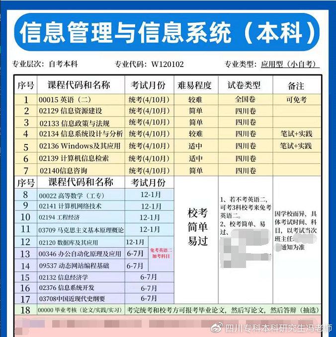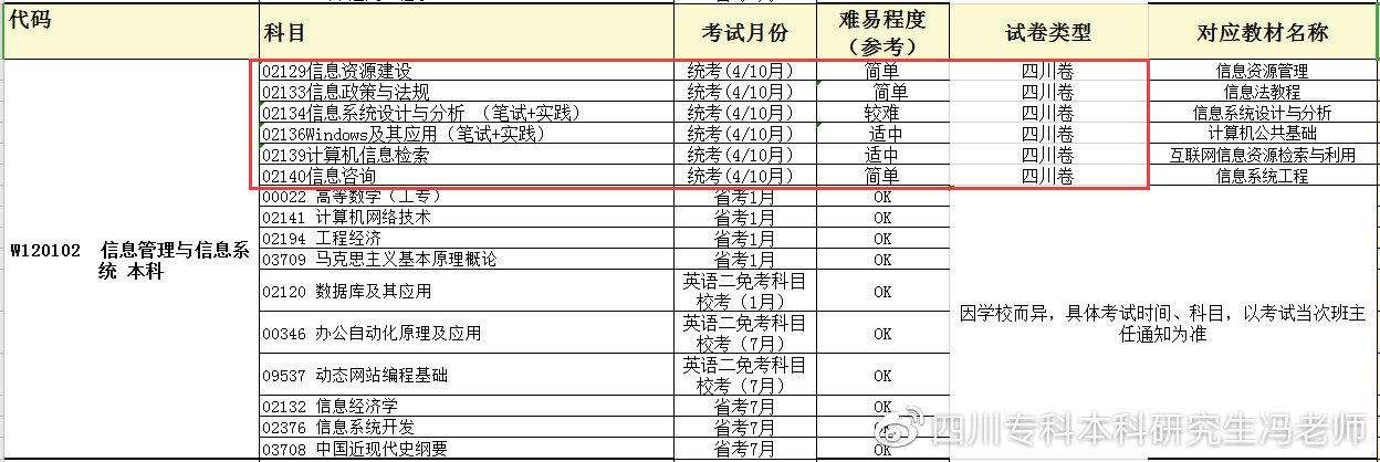 ◆ 信息管理与信息系统科目难易度及考试安排表: