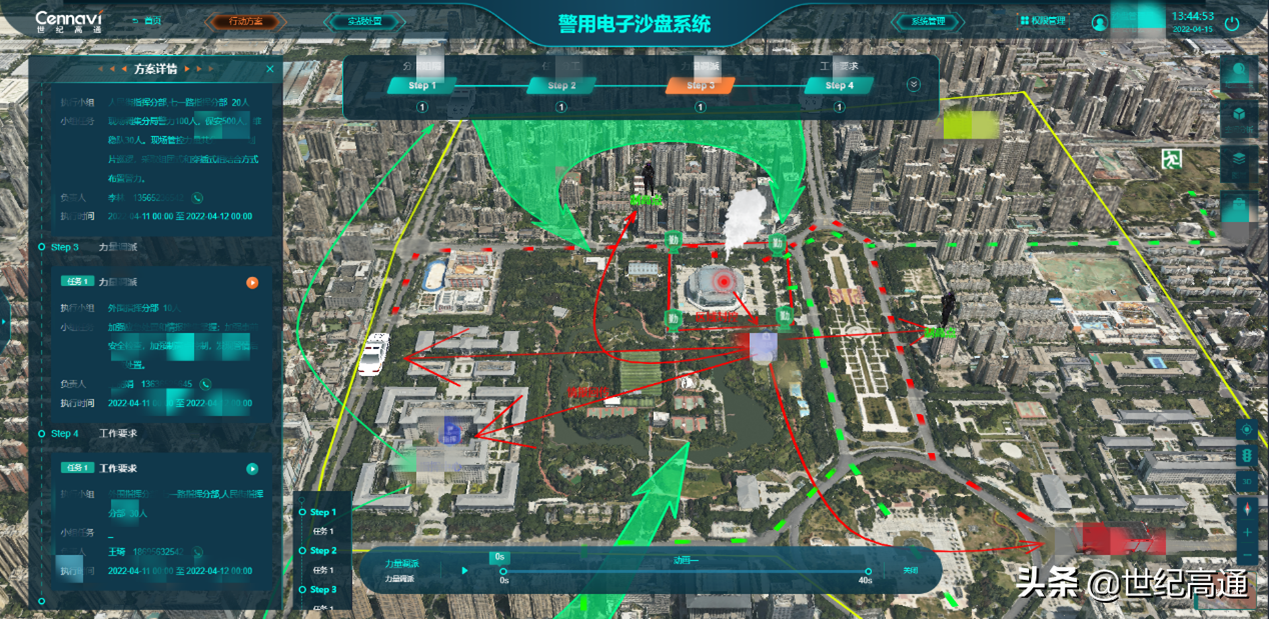 标绘满足公安警务标号规范,支持标绘场景飞行漫游、显隐、生长、运动、粒子等效果,支持预/方案关键任务流程化拆解与推演。