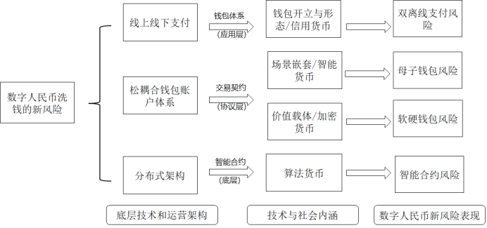 综上,基于数字人民币自下而上的底层技术、协议层的契约和应用层的推广,其智能合约算法、基于加密技术的价值载体、场景嵌套和货币信用等属性逐渐展现,数字人民币的结构和运行方面孕育着潜在的新型风险。