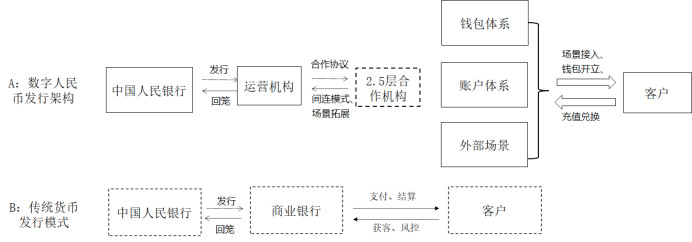 首先,数字人民币以分布式架构作为底层技术。 数字人民币发行、兑换、流通等所有环节均记录到人民银行管理的中心化系统中,央行作为中心主体可借此监测、识别和追溯数字人民币的全生命周期流程,实现对数字人民币生态系统的闭环管理。同时,数字人民币的流转确权依托节点运营机构上报交易请求,由认证中心集中处理,央行作为中心节点掌握着数字人民币各运营机构和钱包之间的全局性信息。数字人民币一个中心、多个节点的分布式技术底层,能充分保证系统架构的稳定性和安全性;其100%的准备金机制,可有效保证其币值稳定和无摩擦兑换,有助于促进普惠金融发展和金融稳定。