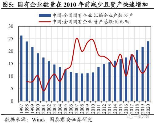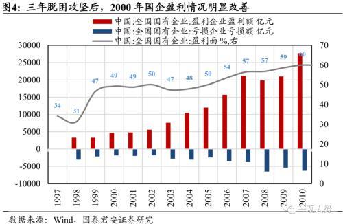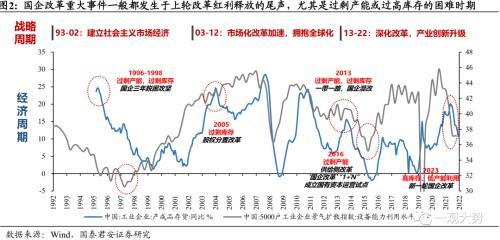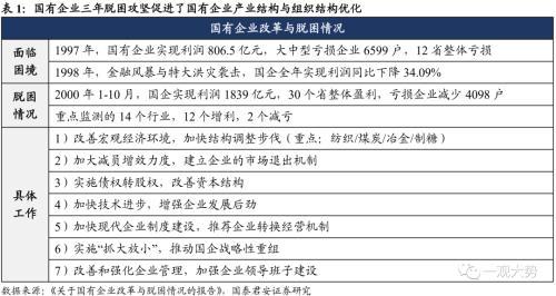 建立现代企业制度,从“国营”走向“国有”。 国有企业的前身是“国营企业”,但随着十四大明确支出我国要建立社会主义市场经济体制,国有企业也要转换经营机制,成为“产权清晰、全责明确、政企分开、管理科学”的独立市场竞争主体。十四届三中全会上,《中共中央关于建立社会主义市场经济体制若干问题的决定》在第一部分总论之后,最先阐述的就是转换国有企业经营机制,建立现代企业制度。由此可见,国有企业改制是在微观层面建设社会主义市场经济的重要举措。1994年7月,《公司法》正式实施,同年11月,国务院将国企改革列为1995年经济体制改革的重点,部署100户国有大中型企业进行现代企业试点。至1998年,三年试点基本达到预期目的,不过仍反映出政企部分、治理结构不规范的现象。世纪末国企改革“抓大放小”“三年脱困”的背后,是90年代过度金融化后的债务危机与库存积压。 90年代市场化探索中最直观的变化就是资本要素开始发挥促进经济增长的作用,外资的大量涌入、国内资本市场的活跃使得国内经济在1992-1997年蓬勃发展。但是,资本要素不仅推动了经济增速,也放大了经济周期。一方面,“抓大放小”战略最初的思路是扶持市场化行业中的龙头,效仿日韩财团模式,通过政府划拨与投资建立涵盖多项实业且与金融混业的财团式企业。多元化经营的思路影响了一大批国内企业,如90年代中期首钢开始涉足集成电路、汽车、地产等多个领域,而盲目扩张的背后却是投资收益的不断下降与杠杆风险的累积,这也是三角债问题的直接原因之一。另一方面,尽管国企在市场化改革初期一直面临效率低下、产品积压、连年亏损的困境,但股票上市的“指标配额制”却使得这些国企的存在得以维系,由此亦诞生了大量财务造假现象。在金融危机的冲击下,过度库存的问题终于暴露,1997年全国工业库存高达3万亿元,以至八部委联合成立了全国库存商品调剂中心,以求加快商品流通。国企改革不仅促进了国企结构优化,更带动了经济与社会体制改革。 国企三年脱困攻坚是在其他领域的改革还不配套,条件还不具备的情况下开始的。因此在改革过程中也带动了社会其他领域的变革。如当时财政并没有发放下岗职工的补偿金的资金,下岗职工的基本生活与医疗保障脱离原单位后没有着落,这些促进了社会保障体系的加快建设。改制时国有资产的流失问题揭露出国有资产管理责任不明确,因此加快了国有资产管理体系的改革,并最终推动了国资委的设立。