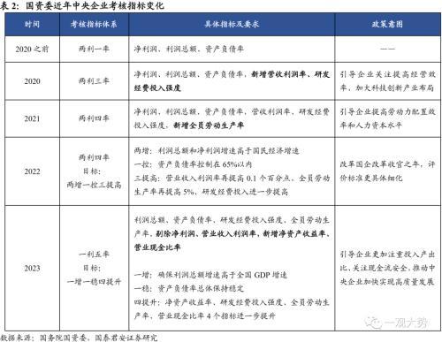 新一轮国企改革开启,国资委提出“一利五率”考核指标,强调从经营效率入手改善ROE水平,提高企业内生现金创造能力。 国资委提出2023年中央企业考核指标为“一利五率”,目标为“一增一稳四提升”,标志着新一轮国企改革深化提升行动的开端。“一增”是要确保中央企业利润总额增速高于全国GDP增速,“一稳”指中央企业资产负债率总体保持稳定,“四提升”即净资产收益率、研发经费投入强度、全员劳动生产率、营业现金比率4个指标的进一步提升。相比两利四率,新的考核指标体系以营业现金比率和净资产收益率替代营收利润率和净利润。结合上文对于国企近十年经营情况的分析可以看出,前期注重考核净利润与杠杆水平的方式实际上给与了国有企业在资产周转率、ROE方面的操作空间,大量国企出现了经营效率放缓、利润增长但没有现金入账、资产回报率不高的现象。新考核标准将重点聚焦央国企经营效率,推动ROE回升。