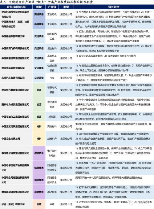 央企链长分布:交运装备/高端设备/信息技术/材料/能源/粮食/医药。 尽管国资委并未明确公布16家链长企业的名单,但我们根据国资委专题报道汇总梳理,推测目前的产业链链长可能在以下20家企业之中。从分布来看,信息技术、装备、材料、能源、医药、粮食等各领域均有分布。其中,交运装备(大飞机/船舶/高铁/汽车),信息技术(网络安全/电子元件/通信)、能源(新能源/新型电力系统)行业龙头集团最多,材料(新材料/战略矿产)、高端装备(工业母机)、粮食(种子)、中药等领域亦存在链长央企。从这一分布看,链长央企不仅聚焦于新一代信息技术、新能源、新材料等前沿领域,也兼顾工业母机、电子元件、种子等短板领域。同时,有相当部分央企链长聚焦于当前产业自主安全风险较大的网络安全、战略矿产、粮食安全等环节。