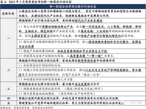 新一轮国改的央国企使命:构建现代化产业体系,提升科技创新水平。 2023年3月,国资委发布《国企改革三年行动的经验总结与未来展望》,明确新一轮国改的重点在“提高企业核心竞争力和增强核心功能”、“在建设现代化产业体系、构建新发展格局中发挥更大作用”。落实在执行上,重点在引领现代化产业体系建设+引领科技攻关与应用转化+支撑国家发展安全水平。结合国资委主任在2月的讲话,我们认为央企未来在现代化产业链建设中的任务主要包括:1)加大对新兴战略产业链布局力度,23年布局提升2个百分点;2)推进战略重组与专业化整合,提高直接融资比重,增强龙头优势;3)加大对于产业链上下游“专精特新”“单项冠军”企业的培育力度。在科技创新方面,全面发挥央企的引领作用,主导产学研融合,引领技术攻关与应用。在安全发展领域,加大对于能源粮食安全与基建的布局。
