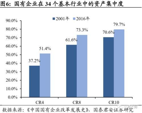 向上游集中、向主业集中,十年间国有企业垄断优势明显提升。 2003-2012年,央企数从2003年的196家减少到2012年的117家,单个企业竞争力明显提升。国有经济战线收缩,但其盈利能力和控制力却不断增强。国有工业企业销售收入占比,从2000年前后的50%以上降至2012年的27%。而央企的营业收入从3.4万亿元增加到22.5万亿元,增加5.7倍。央企80%以上的资产集中在国防、能源、通信、冶金、机械等行业, 117家央企明确主业,逐步退出非主业领域。2012年,纺织轻工等领域已基本没有央企参与,房地产、食品等行业央企占比不到4%,竞争性领域基本已全面交由民营企业与外资发展。央企整体素质得到提升。117 家央企,绝大多数成为行业三甲,不少央企进入了全球行业十强,逐步掌握国际市场话语权和规则制定权。
