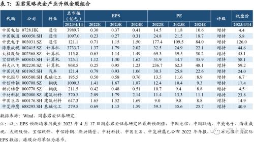 推荐国君央企产业升级、央企产业安全金股组合。 央企在新时代下将承担起引领现代化产业体系的使命,其内涵包括推动产业链实现突破升级与维护国内产业链、能源与粮食安全。我们认为当前有两种择股思路,其一是从国资委发布的产业链“链主”视角出发,优选链主集团下与对应产业链建设使命相关的重点上市公司。其二是从国有资本投资&运营公司视角出发,优选旗下与构建现代化产业体系相关的上市公司。基于以上思路,推荐国君策略央企产业升级、国君策略央企产业安全两个金股组合。1)国君策略央企产业升级: 中国电信/海康威视/科大讯飞/中国汽研/中化国际/中信特钢/中复神鹰等14只个股;2)国君策略央企产业安全: 国电电力/电投能源/招商南油/荃银高科/华润三九/中材国际等9只个股。此外,关注国君策略央企产业链受益组合,包括:中国移动/许继电气/平高电气/中国软件。