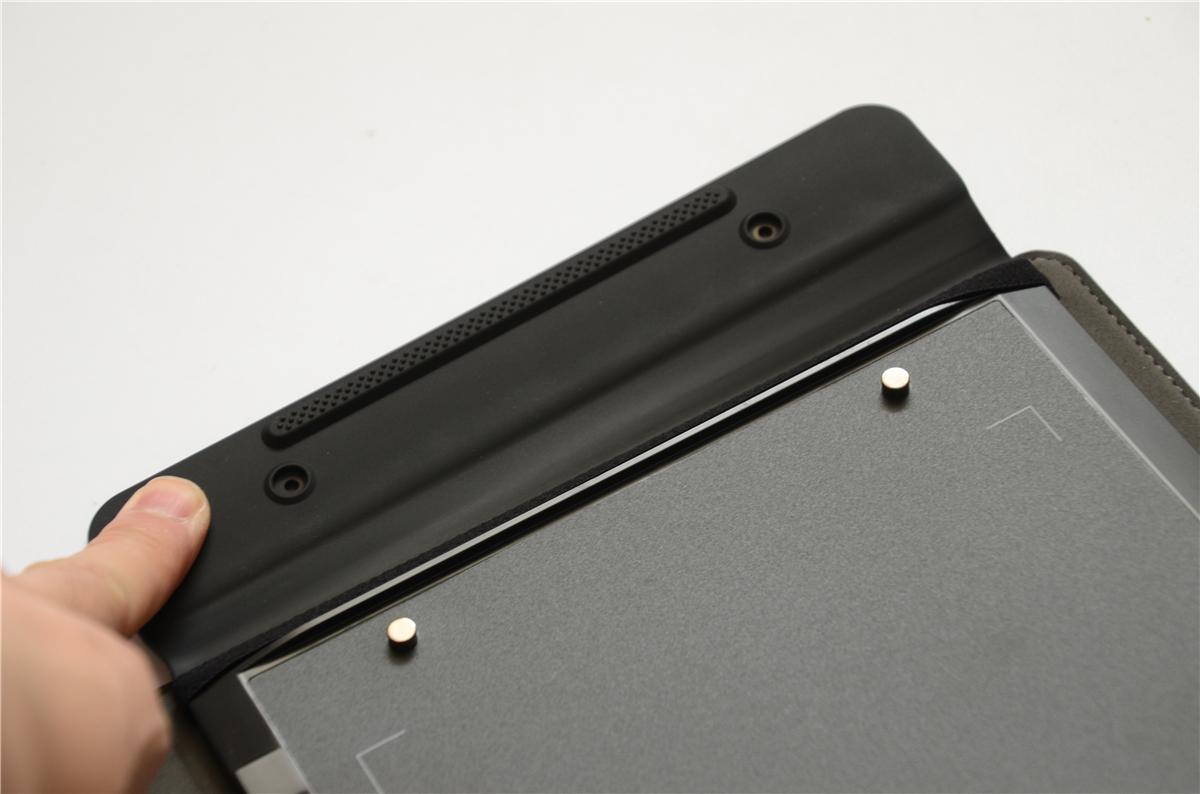 打开手写板顶端的磁力固定夹,可以看到有摩擦力很强的一段橡胶条,而两个突出的固定柱则是放置手写纸固定使用的,固定夹部位的2个凹槽则是与固定柱对应。这样做的好处就是可以很好的让手写纸稳固在手写板上。