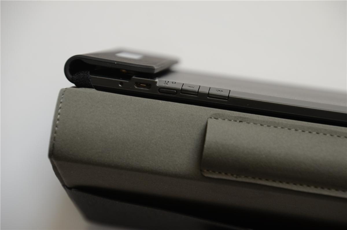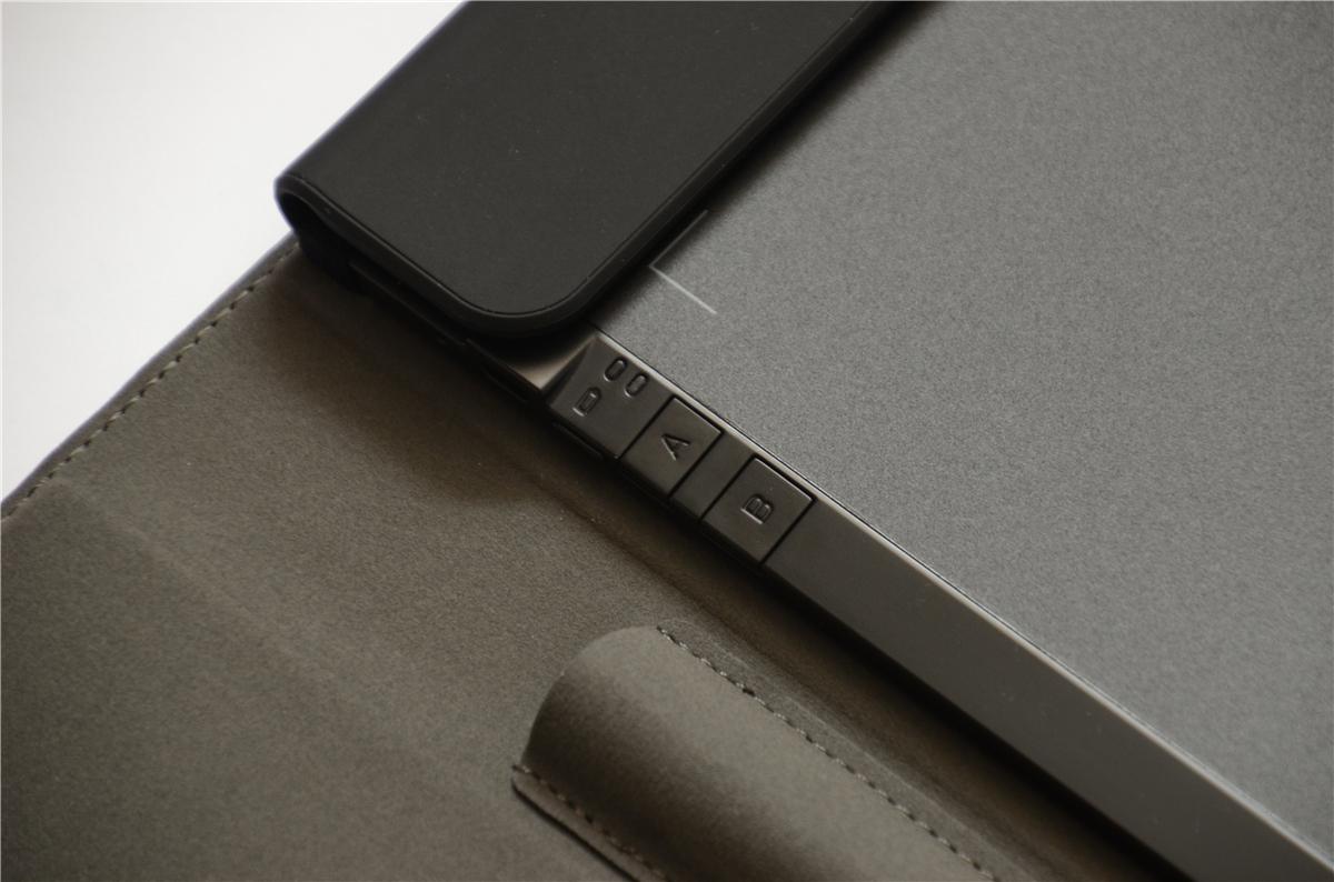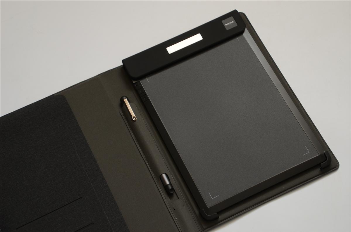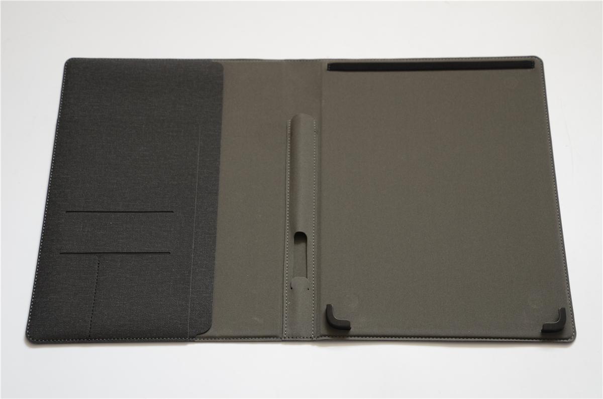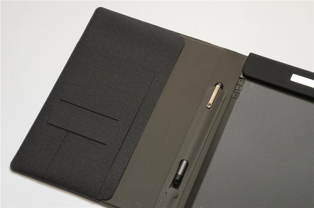 智能手写板在设计上倾向于多用途使用,在保护套的设计比较倾向于商务,打开保护套,可以看到内部有几个隔断,可以放名片、文件、小笔记本等,中间部位设计有笔袋,手写笔可以完全放置在笔袋里,笔袋的底部可以放置一个七号电池,让手写笔的续航时间更长。