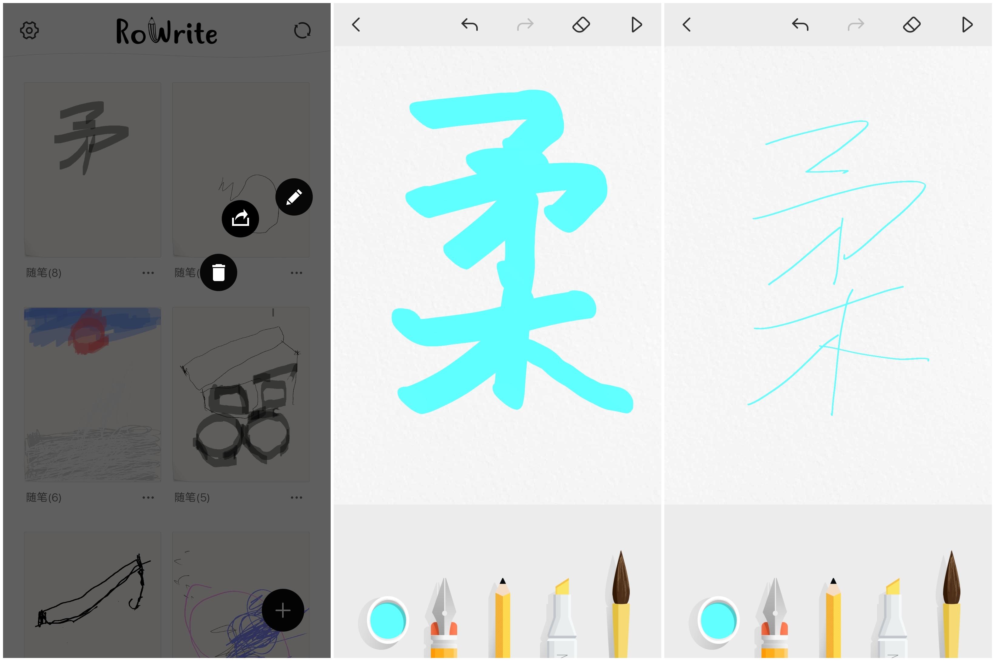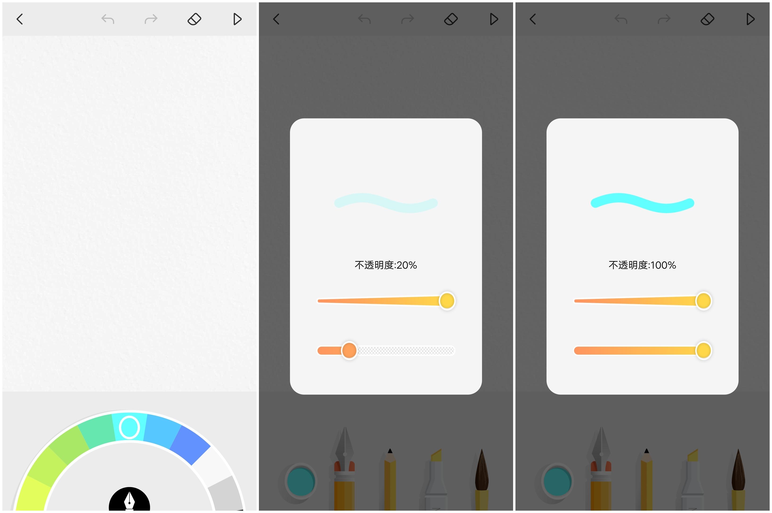 APP提供了不同的颜色,方便书写或者是画出漂亮的图画,而笔的类型提供了四种,并且在笔的粗细和透明度上提供了不同的选择,左右滑动即可调整笔尖的样式,很实用。