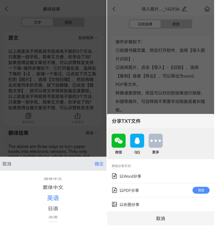 转换速度很快,还可以对识别结果进行翻译,如果你想要制作外语电子书,可以用这个功能哦,然后选择导出文件格式就可以啦。