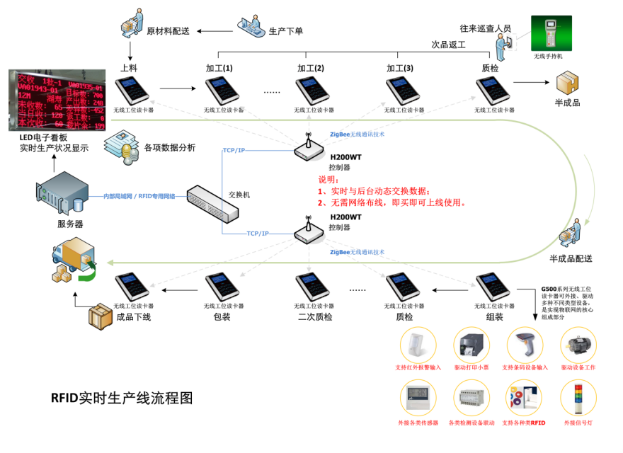 可根据生产订单分配工作,发工序卡,利用RFID技术进行数据采集,通过无线网络传输数据,用可视化软件系统管理。