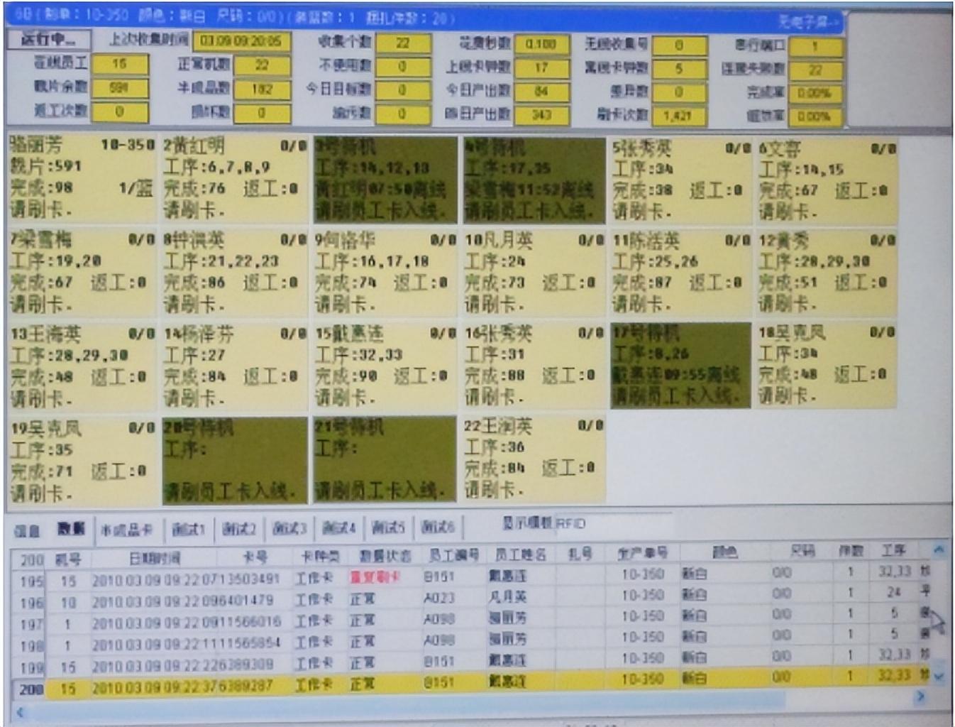 ID卡是与裁片放在一起并循环使用,员工完成后需立即刷卡才能传递给下一员工,刷卡数据会立即传送到电脑进行汇总处理,管理者即可实时了解生产状况。