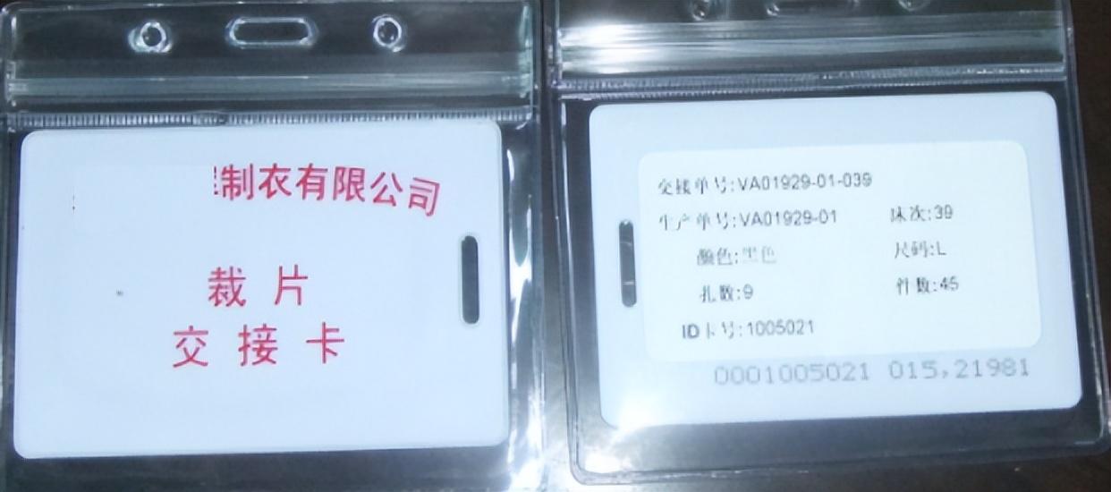 在车间上会分成很多生产线,每一条生产线都会配有很多篮子,每个篮子都绑上一张ID卡(称作车缝卡),如图: