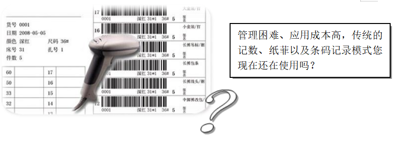 传统的管理方法已经不能满足现代工业的发展和需求,主要的问题在于:原材料成本上涨、员工分工不均、传统不科学的管理。传统的服装加工厂使用条码纸工票来记录每个工人的计件数量,不仅消耗员工大量的时间成本,还无法满足现代工厂的需求。