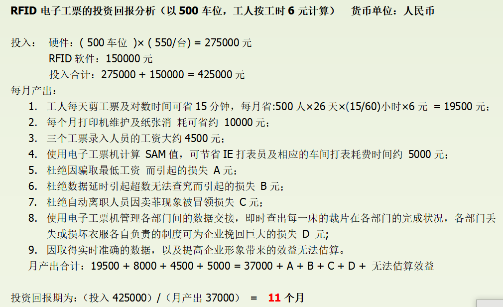 B. 智能卡可重复使用10年以上,节省员工剪工票、扫描条码时间,无需专门的统计人员,减少人员,节省工资成本。按刚刚1000人的工厂计算,一年节省耗材成本¥96000元,统计人员工资¥54000元。一年共节省耗材、人工成本¥15万元;