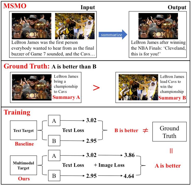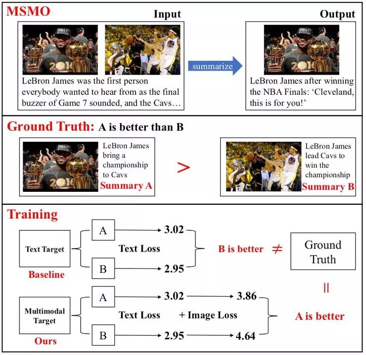 这种做法容易带来模态偏差的问题,即整个网络会倾向于优化文本生成的质量而忽视了图片的挑选过程,如图1所示。若只考虑文本模态的损失,B摘要是要优于A摘要的,但是很显然B摘要中的图片的人物对应关系不对;而当我们引入图片选择的损失时,我们可以明显的判断出A摘要是优于B摘要的,并且这也符合基本事实。