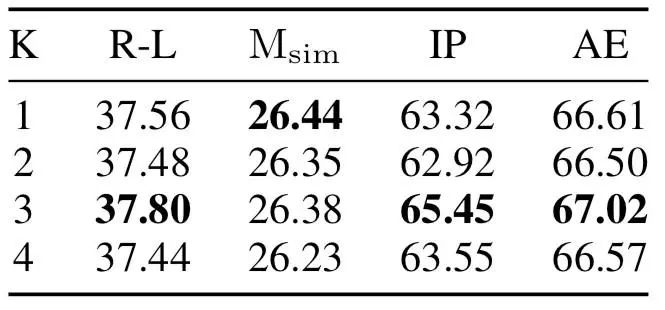 我们对比了在计算图片损失中考虑的图片数量(即top-K图片作为gold standard)所带来的影响,并且发现当 K=3的时候,模型取得了最好的效果。