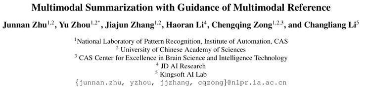Junnan Zhu, Yu Zhou, Jiajun Zhang, Haoran Li, Chengqing Zong, Changliang Li. Multimodal Summarization with Guidance of Multimodal Reference. AAAI-2020.