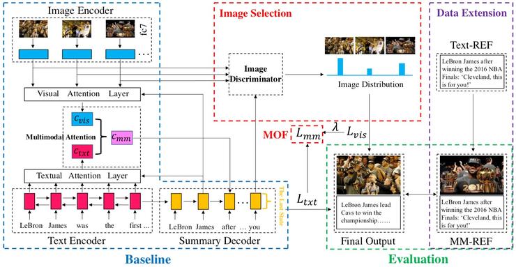 针对于上述问题,中科院自动化所自然语言处理组博士生朱军楠、周玉研究员、张家俊研究员、宗成庆研究员等提出了多模态基准指导的多模态自动文摘方法。基本想法是优化多模态摘要训练的目标函数,即在文本损失的基础上增加图片选择的损失函数。