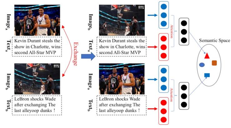 (3)通过数据集中的图片和文本描述构造文本-图片对齐片段从而用来训练能够更好地评价多模态片段的评价模型,具体而言我们将两对图片-描述的文本部分(或图像部分)进行交换去构造两个匹配的多模态片段,如图3所示。