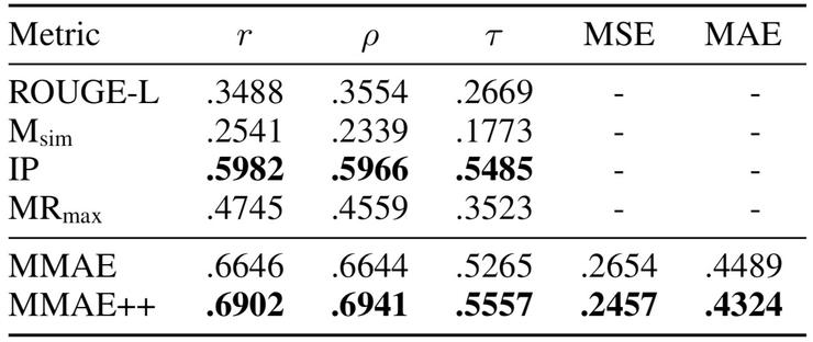 在我们的方法中,我们引入一个新的自动评价指标MRmax用来直接度量两个多模态信息之间的相似度(输出和参考答案的最大相似度)。MMAE是对IP、ROUGE和Msim的组合,MMAE++是IP、ROUGE、Msim和MRmax四个自动评价指标的组合。我们利用与人工打分之间的相关度来对比不同的自动评价指标。
