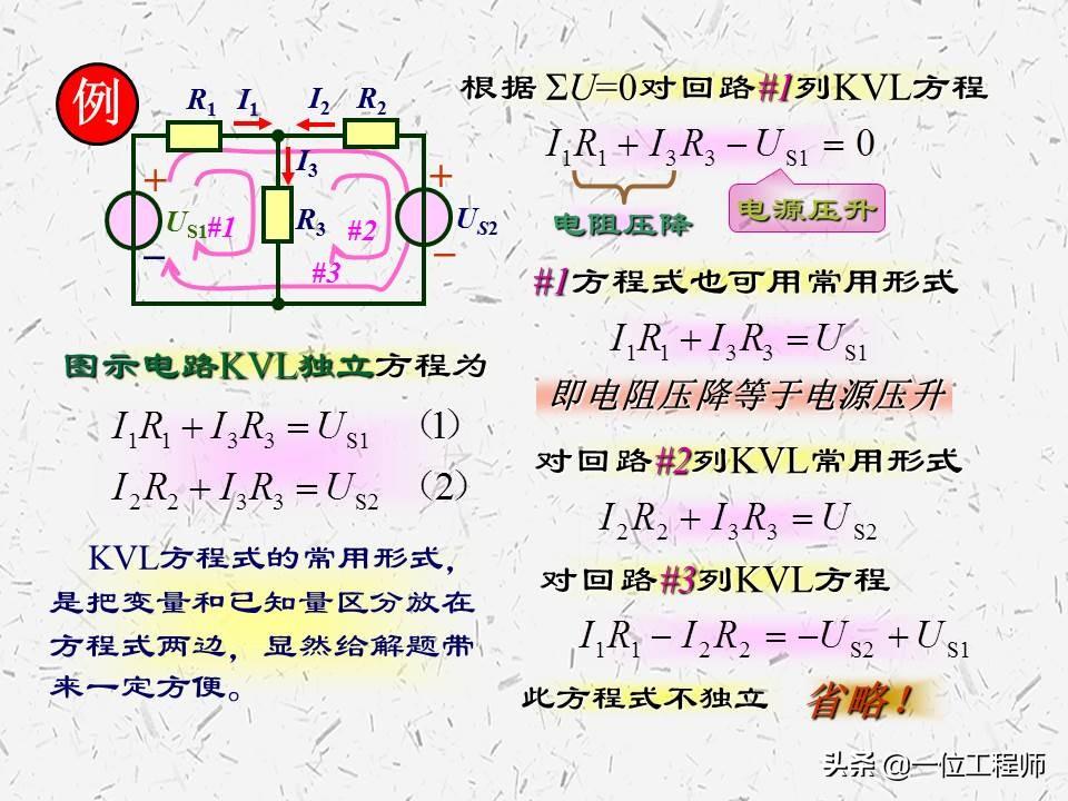 基尔霍夫第二定律:在电路中任取一闭合回路,并规定正的绕行方向,其中电动势的代数和等于各部分电阻和电流乘积的代数和。