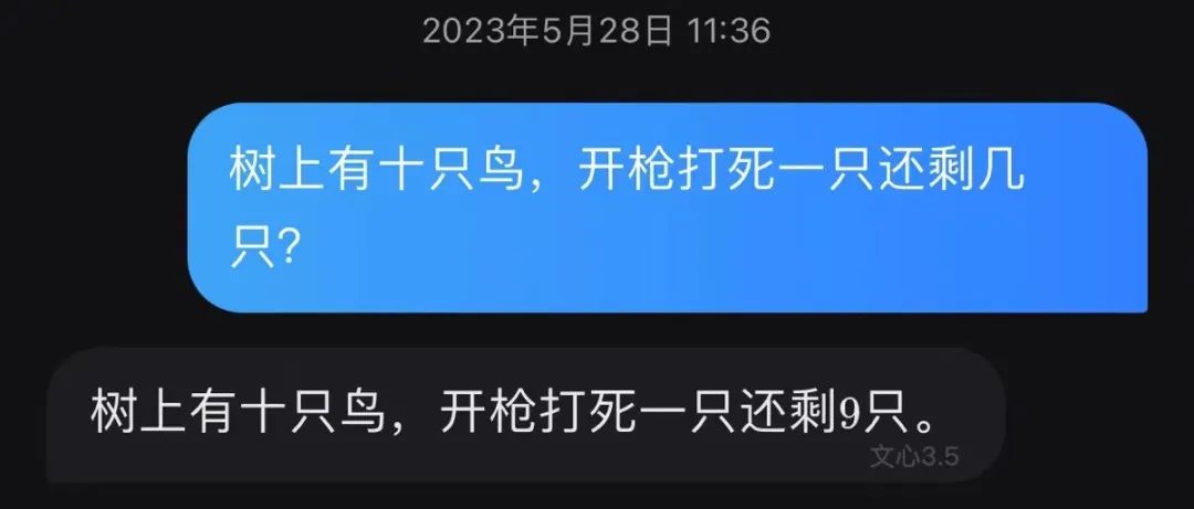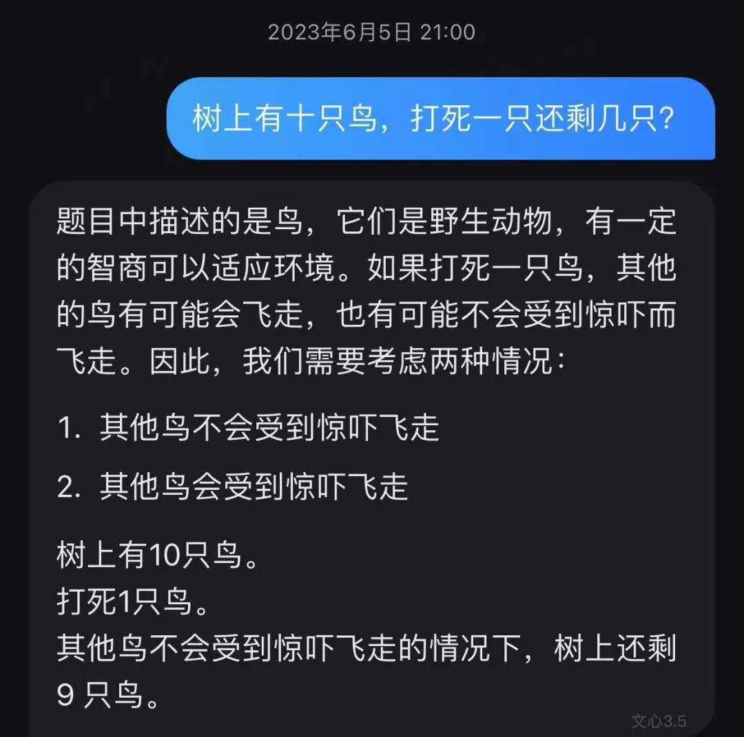 甚至,他会用一些常见的问题,定期测试不同版本的智能助手。比如,用 “树上十只鸟,开枪打死一只还剩几只” 来测试不同版本的回答。