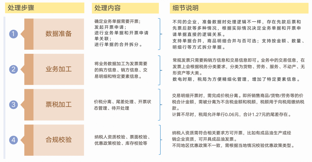 业务数据,时常跟税局要求的开票数据有出入,在准备开票前,需要进行业务加工,将业务数据加工为发票需要的购方信息、销方信息、交易明细和特定要素信息。