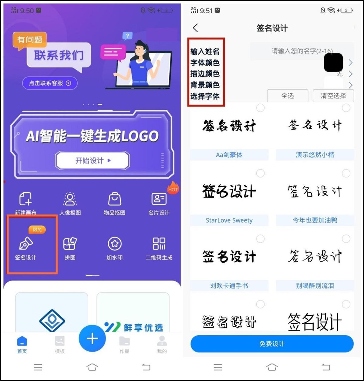 打开软件,进入首页后点击选择【签名设计】功能 ,然后输入姓名,设置字体、颜色等,选择模板后点击【免费设计】 即可生成~