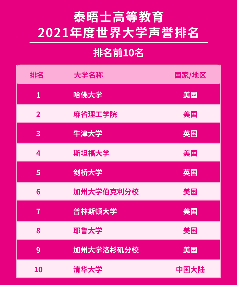 在同样刚刚发布的《泰晤士高等教育2021年度世界大学声誉排名》中,哈佛大学排名第一、麻省理工学院排名第二、斯坦福大学排名第四。